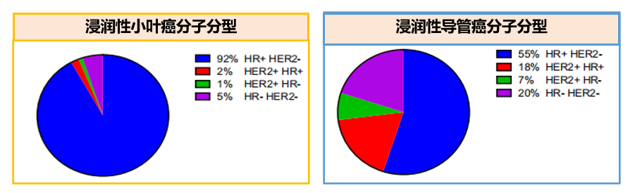 以占比最高的Luminal型为例子,ILC与IDC(Invasive Ductal Carcinoma浸润性导管癌)在病理学方面也存在很多差异,首先是免疫浸润微环境上的差异,2018年发表在《Journal of the National Cancer Institute》的文章,报道多中心回顾性系列显示:与IDC相比,ILC中平均TIL水平5%。高TIL水平与年轻、淋巴结受累和高Ki-67指数相关。且ILC中高TIL水平与较差的预后相关。与之相呼应的是诺丁汉系列研究,其显示:与IDC相比,ILC的肿瘤内CD8+TIL水平明显低于总CD8+TIL水平。另外,Luminal型ILC和IDC的HER2突变情况也不同。早期IDC中ERBB2突变的富集频率约为1.4%(18/1301),与之相比ILC中富集频率更显著为5.7%(16/279),而转移性ILC中ERBB突变率更高,达到15%,且ERBB2突变型ILC患者临床提示具有不良预后。靶向ERBB2突变状态是ILC患者10年总生存期(OS)的独立预后标志物。[4-5]