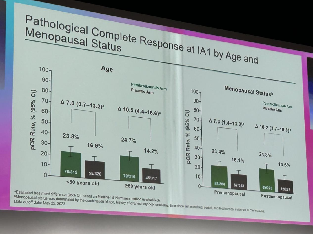 “现在我们可以证明这些pCR率的出现与患者的年龄或绝经状态无关。在50岁以下的患者中,帕博利珠单抗组的pCR率为23.8%(76/319),而安慰剂组的pCR率为16.9%(55/326),50岁及以上患者的pCR率分别为24.7%(78/316)和14.2%(45/317)。在绝经前患者中,pCR率分别为23.4%(83/354)和16.1%(57/353),而在绝经后的患者中,pCR率分别为24.8%(69/278)和14.6%(42/287)。”
