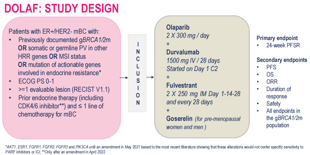 DOLAF研究旨在评估奥拉帕利(PARP抑制剂)、度伐利尤单抗(免疫检查点抑制剂)和氟维司群(选择性ER降解剂)联合治疗在ER+/HER2-转移性乳腺癌(mBC)患者中的疗效和安全性。