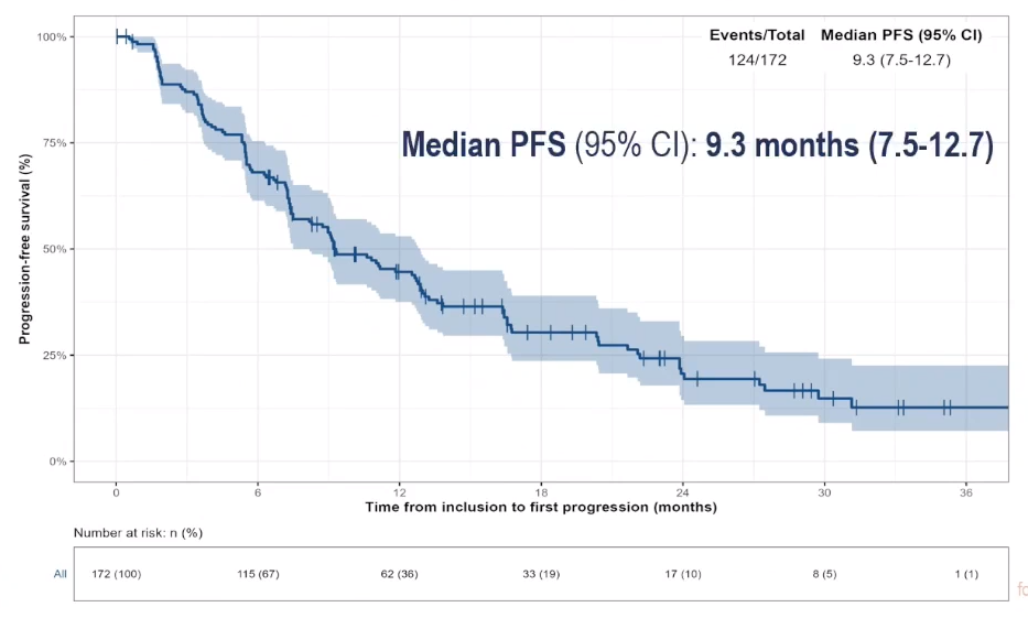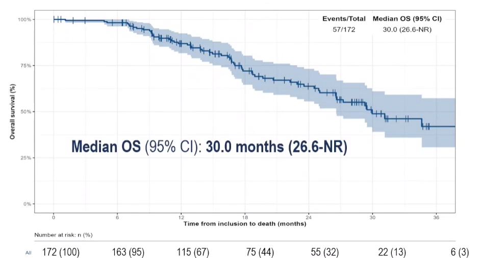总体随访时间的中位数为24.6个月(95%CI,19.3-28),24w PFSR为66%,中位PFS为9.3个月(95%CI:7.5~12.7个月),中位OS为30个月(95%CI:26.6~未达标[NR]),ORR为41%(95%CI:33.5%~49.3%)。