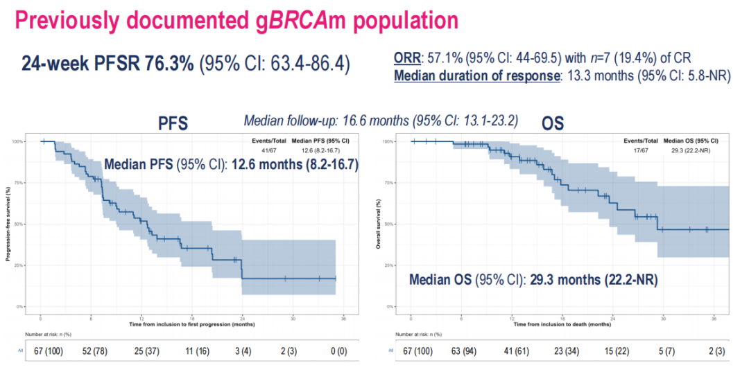 先前确诊过胚系gBRCA突变的人群中,24w PFSR为76.3%(95%CI:63.4%~86.4%),中位PFS为12.6个月(95%CI:8.2~16.7),中位OS为29.3个月(95%CI:22.2~NR),ORR为57.1%(95%CI:44%~69.5%)。