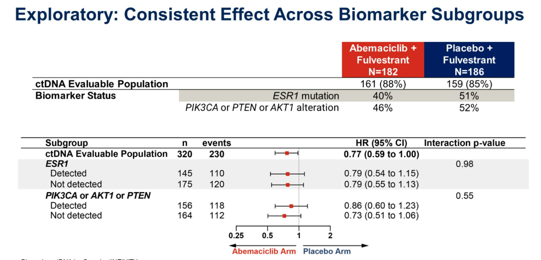 这样微小的获益幅度提示或许可以进一步筛选出CDK4/6i跨线真正获益的人群。比如亚组分析中,既往CDK4/6i疗程长(疗程≥12个月,表明CDK4/6i疗效好)的患者获益更佳(HR 0.70),内脏转移的患者获益更差(HR 0.87)。尤其值得注意的是,携带PIK3CA或AKT突变或PTEN丢失的患者,CDK4/6i跨线治疗获益并不理想(HR 0.86)。这也反向提示我们如果患者携带PIK3CA/AKT/PTEN此类有意义的突变,选择PAM通路抑制剂可能获益更好。