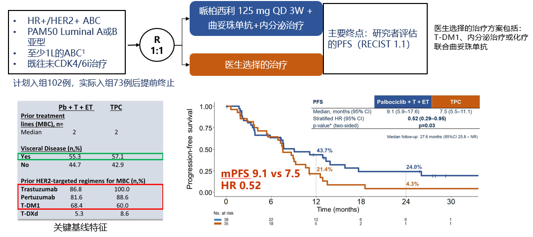 5.Ciruelos E,Pascual T,Villacampa G,et al.Primary results from PATRICIA cohort C(SOLTI-1303),a randomized phase II study evaluating palbociclib with trastuzumab and endocrine therapy in pretreated HER2-positive and PAM50 luminal advanced breast cancer[J].2024 ASCO Abstract 1008.