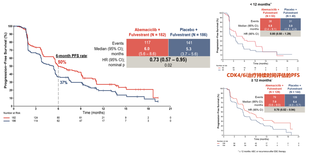 2022年ASCOⅢ期postMONARCH研究对CDK4/6i治疗失败HR+/HER2-晚期乳腺癌患者分别予以阿贝西利+氟维司群和安慰剂+氟维司群治疗,结果显示,阿贝西利组较安慰剂改善mPFS,为6.0个月vs 5.3个月(HR=0.73,p=0.02),提示了CDK4/6i跨线治疗的可行性[11]