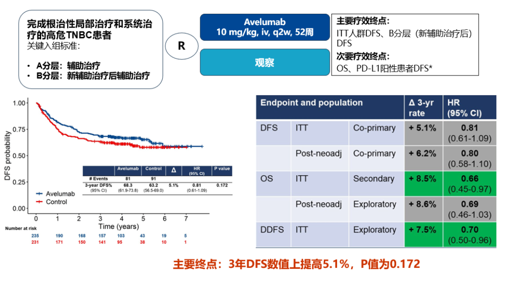 对于早期三阴性乳腺癌(TNBC)而言,在KEYNOTE 522研究于新辅助、辅助治疗取得成功,而IMpassion 130辅助治疗失利的背景下,免疫治疗用药顺序是否对TNBC疗效有影响值得考虑。2024 ASCO的A-BRAVE研究对高危人群TNBC患者予以阿维鲁单抗辅助免疫治疗,结果显示无疾病生存期(DFS)免疫辅助治疗与安慰剂组并无显著差异。