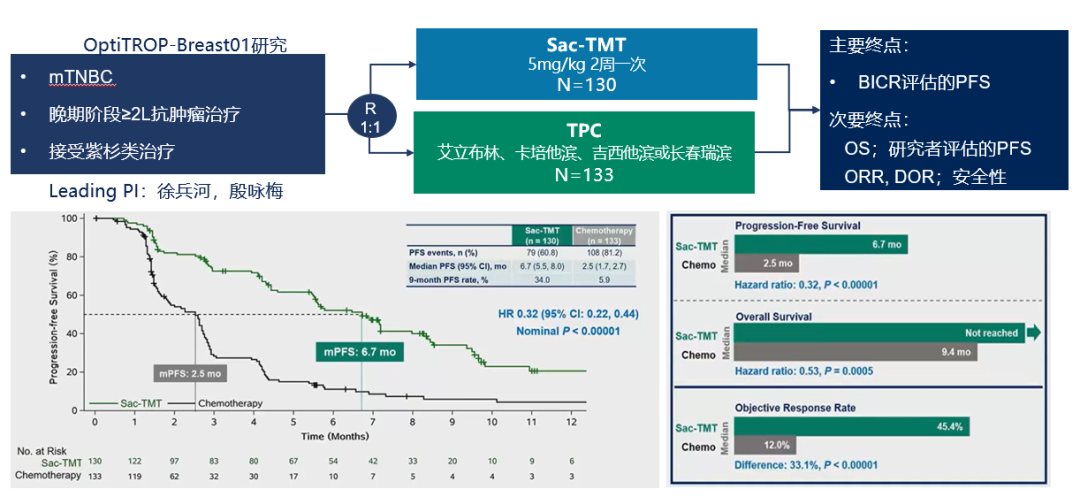 图13.OptiTROP-Breast01研究的入组、PFS和OS结果