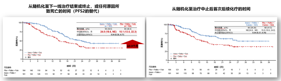 2024年ASCO进一步披露INAVO120研究PFS2(从随机到下一线治疗结束、终止或死亡的世界),结果显示Inavolisib+哌柏西利+氟维司群获益更多,为24.0个月vs 15.1个月,支持以Inavolisib为基础的方案获益可能性[9]