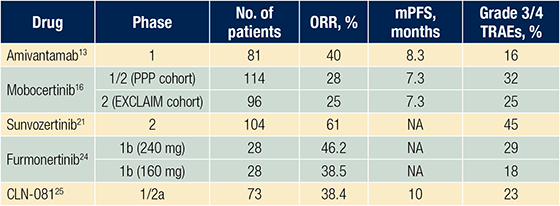 除了这些药物开发外,其他新型Ex20ins特异性EGFR-TKI(包括伏美替尼[furmonertinib]、CLN-081和BLU-451)正在研究中,在EGFR Ex20ins突变NSCLC患者治疗中取得有前景的早期结果[24-26]。表中总结了在经治EGFR Ex20ins突变NSCLC患者中开展的关键前瞻性临床试验[13,16,21,24,25]